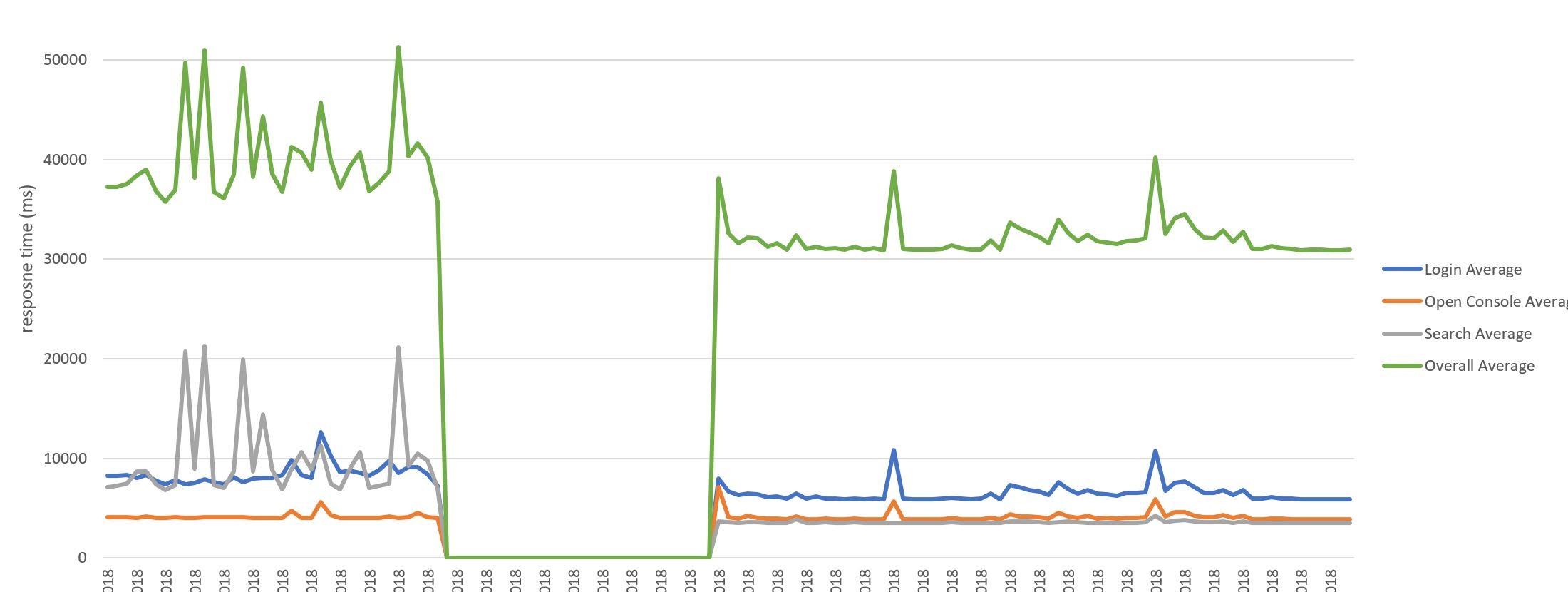 There was a noticeable improvement in performance post-upgrade. The overall response time (green line) dropped to an average of about 31seconds, from an average of around 40, with peaks of 50 seconds. Similarly, the subsequence transactions all improved post upgrade, particularly the timers for login and search, with the variation in response times is pretty much ironed out.